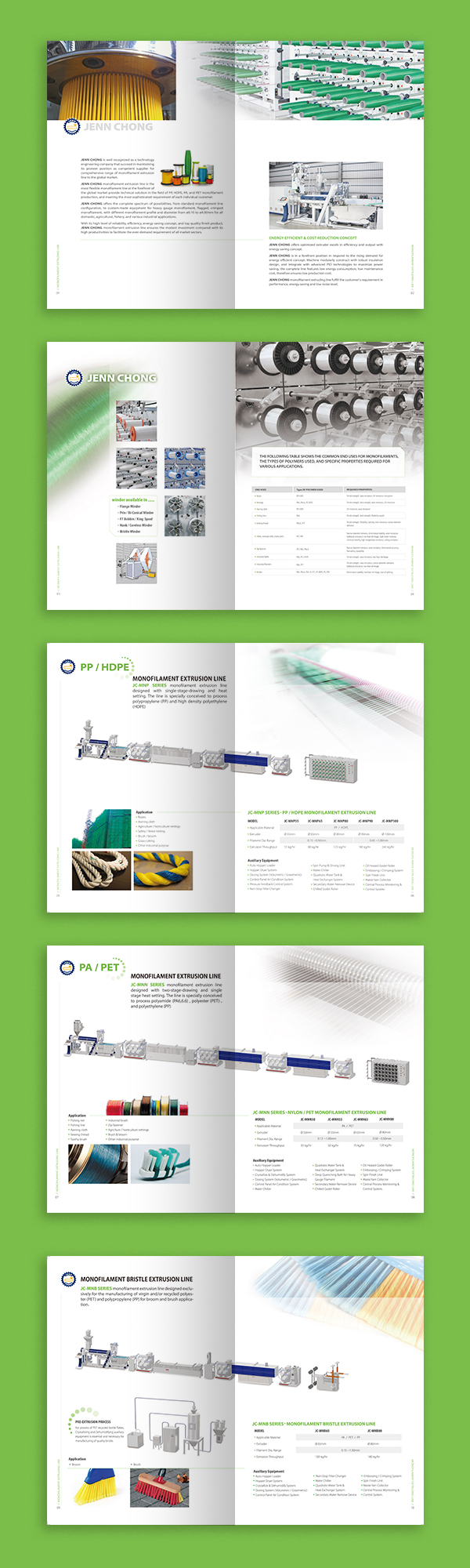 塑膠線材機台廠商,使用不同顏色分別產品機台,整體使用國際雜誌畫報風格,呈現風格較多留白展現機台細節,利用大量的機台產品圖案壓底和交錯的編排文字風格,完成一款國際化的產品型錄。