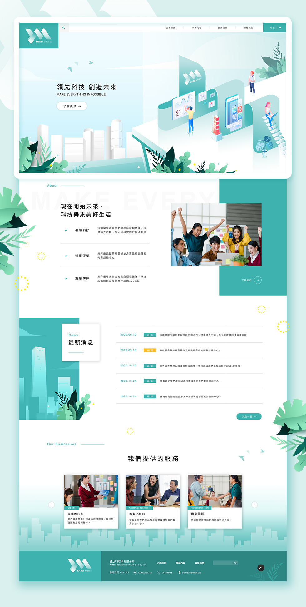 整體使用插畫風格,搭配穩重清新的藍綠色,展現資訊公司的科技感。首頁畫面使用亞米科技的Logo形狀繪製成公司內部擺設,加上外圍未來感的建築及綠意,體現公司企業忠旨:「現在開始未來,科技帶來美好生活」。