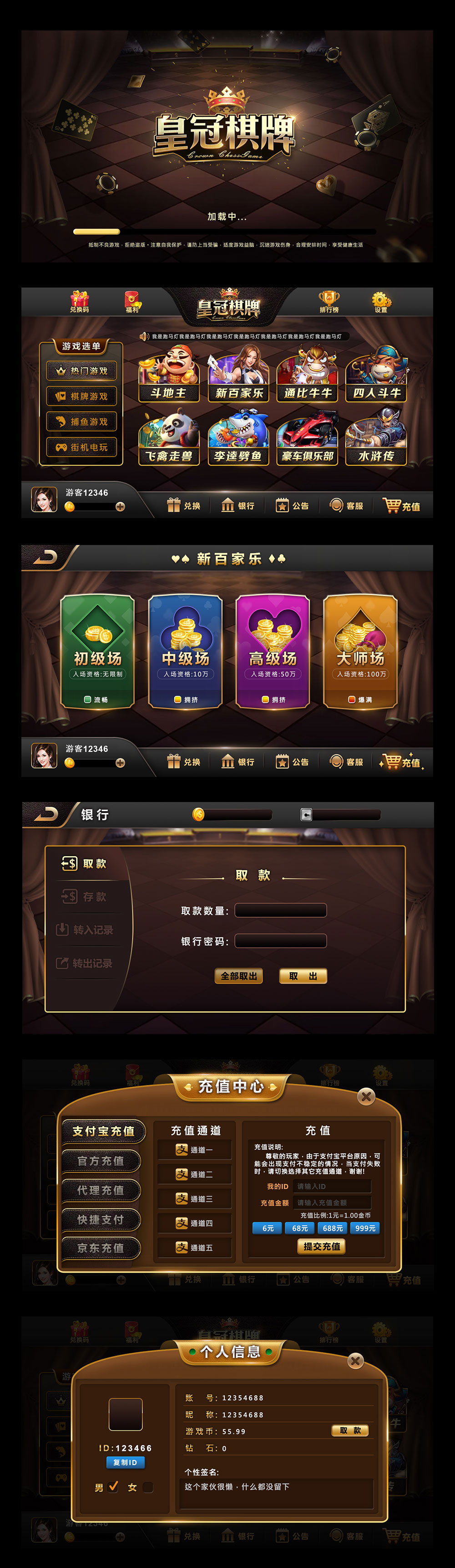 此款為棋牌遊戲的手遊App,使用黑金風格搭配咖啡色皮革的質感做呈現,內部主題用撲克牌花色去搭配。