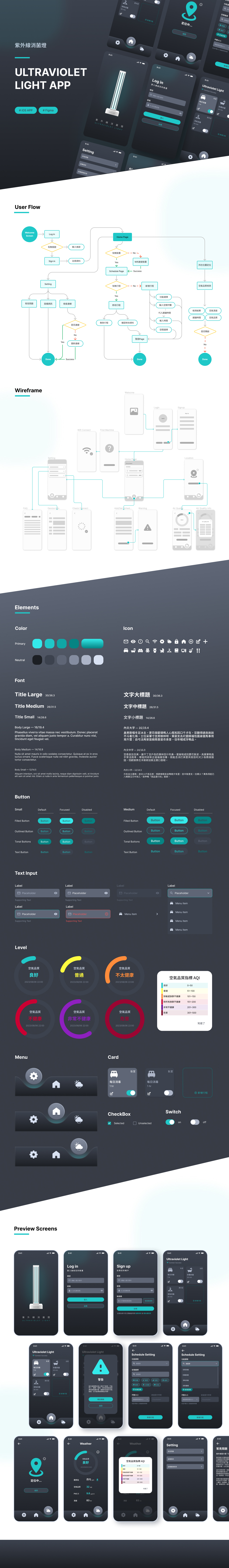 此為紫外線消菌燈的iOS APP,用於開啟裝置及規劃消毒行程,附加功能為查詢空氣污染狀況,從User Flow的規劃到Wireframe的配置再到最後Mock Up製作,皆使用Figma完成。