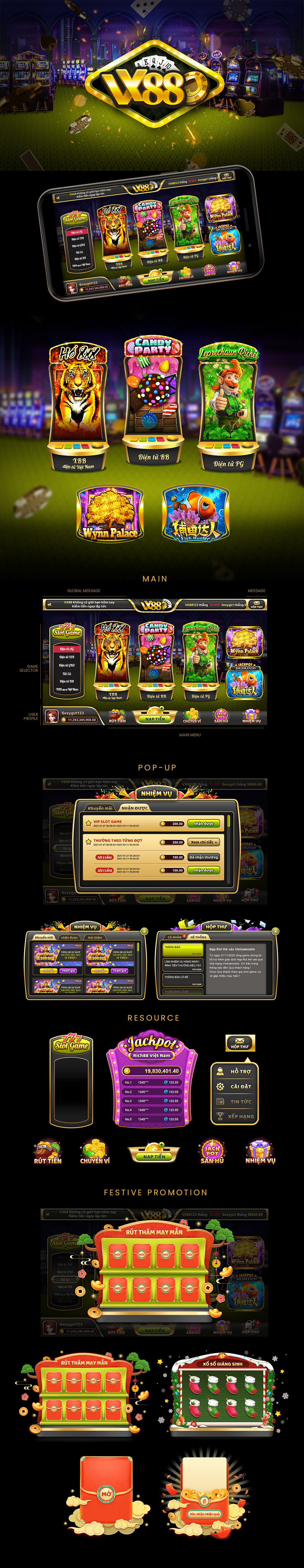 此款為電子遊戲的手遊App,使用黑金風格營造奢華感,再搭配業主本身的綠色為主體。一進入畫面為賭場背景讓使用者有遊戲臨場感,首頁遊戲頁面繪製電子真實機台的模樣為主打遊戲吸引使用者點擊,遊戲介面及物件整體都使用立體風格展現華麗。