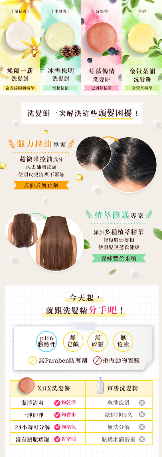 XiiX洗髮餅是天然的洗髮產品,擁有不同的香氛植萃產品,此款設計風格運用產品成分的素材點綴,以及日式的貼文風格加上少女塗鴉小素材,增加商品頁的有趣及豐富度。